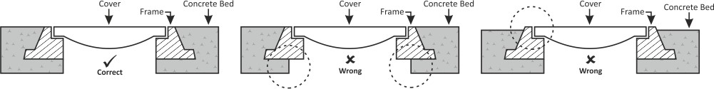 You must place it in the opening and ensure it fixes with the surrounding surface. Use the spirit level to check for evenness. Tamp the frame lightly where necessary to ensure it is absolutely levelled. Once completed, pour more concrete around the frame so that the bed is level with the top of the frame. The image below depicts this.